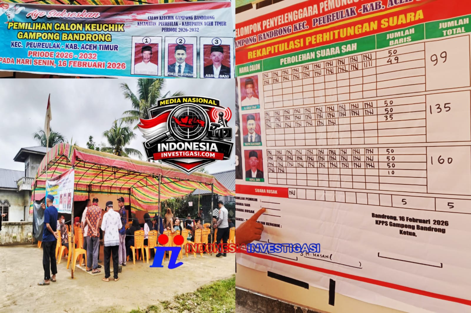 Dari hasil tersebut, Asrul Sani unggul dengan perolehan suara terbanyak, yakni 160 suara, dan berpeluang besar ditetapkan sebagai Keuchik Gampong Bandrong terpilih untuk periode 2026–2032.