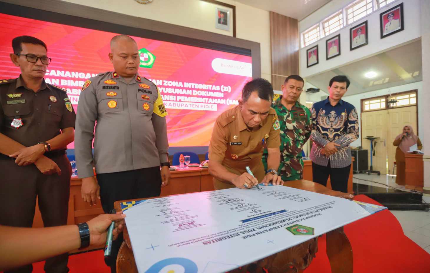 Acara ini akhiri dengan Penandatanganan Pencanangan yang disaksikan oleh Pj Bupati Pidie, PJ Sekda Pidie, Wakapolres Kabuapten Pidie, Dandim 0102/Pidie, Kajari Pidie, Pengadilan Negeri Pidie, Ketua DPRK Pidie, dan dilanjutkan dengan foto bersama.