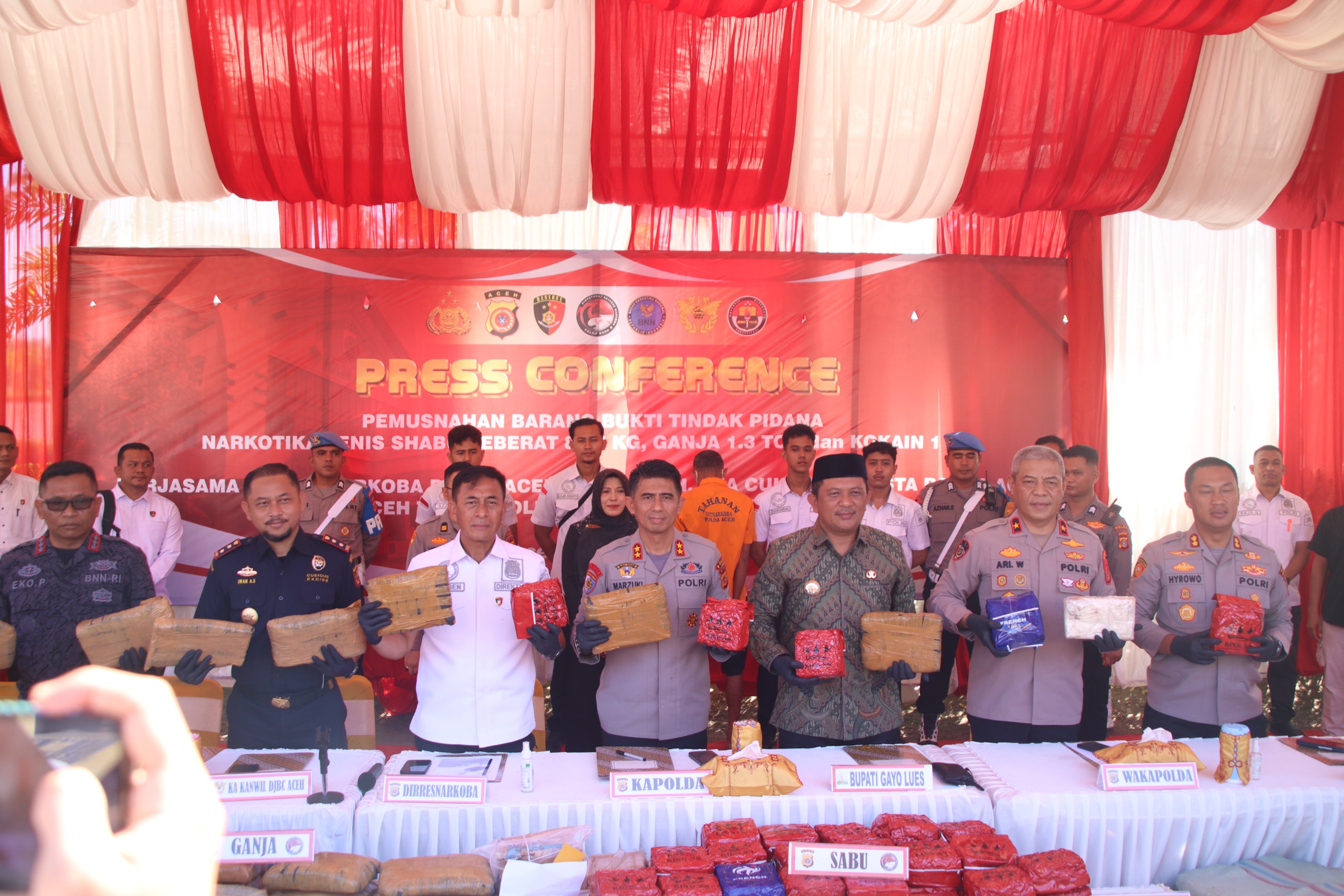 BANDA ACEH — Ditresnarkoba Polda Aceh bersama Badan Narkotika Nasional Provinsi (BNNP) Aceh, Direktorat Jenderal Bea dan Cukai, Polresta Banda Aceh, Polres Aceh Timur, Polres Gayo Lues, dan Polres Sabang berhasil menggagalkan peredaran narkotika jenis sabu seberat 80,5 kilogram, ganja 1,3 ton, serta kokain 1 kilogram dalam kurun waktu tiga bulan terakhir.