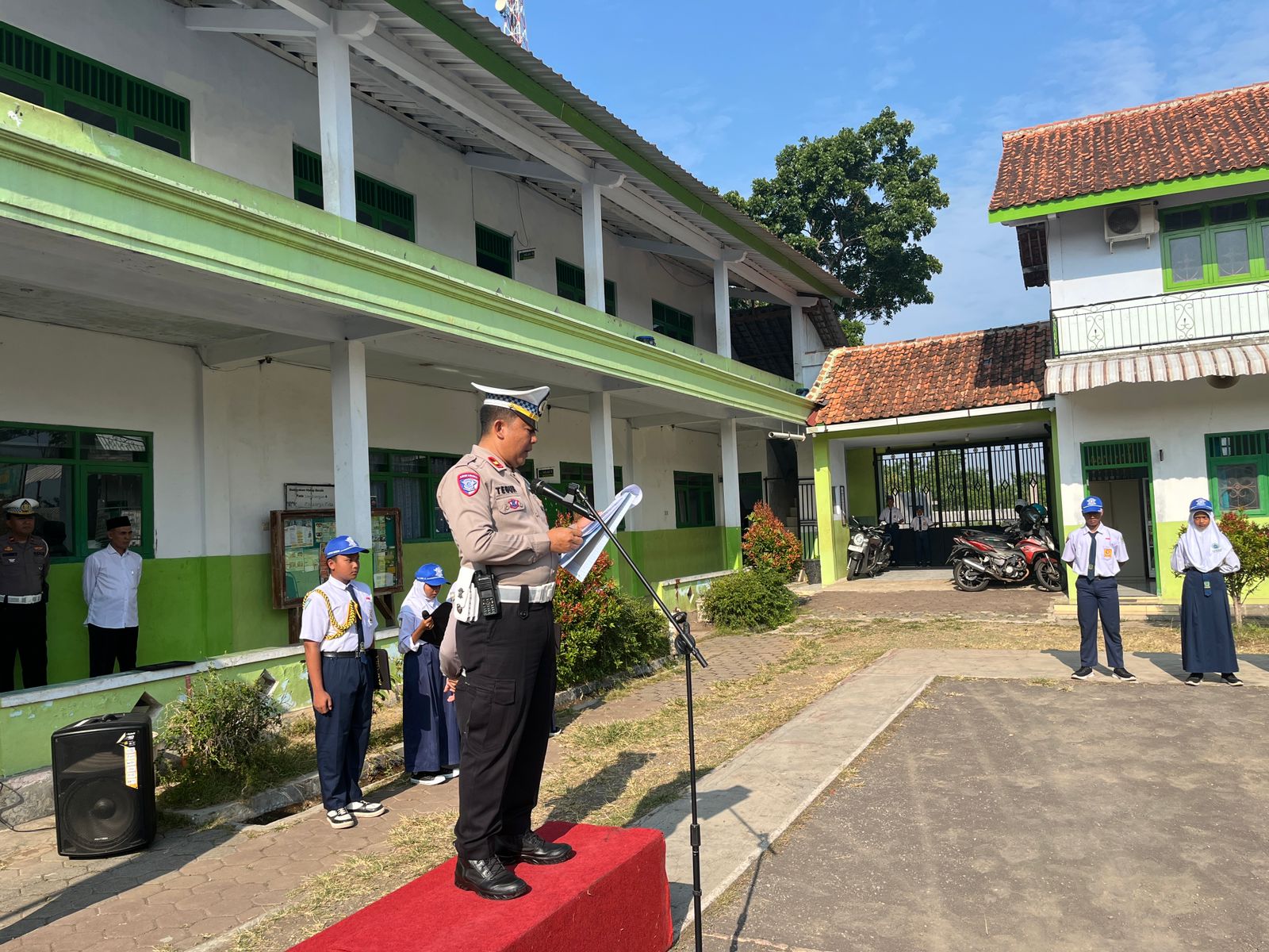 Pekalongan – Jawa Tengah *-Polres Pekalongan -Polda Jateng – Satlantas Polres Pekalongan melaksanakan program Police Goes to School dalam rangka Ops Zebra Candi 2024. Kali ini, Kaurbinopsnal Satlantas Polres Pekalongan Ipda Teguh Subiantoro menjadi Pembina upacara di MTs Ma’arif Karanganyar, Senin (21/10). Dalam arahannya, Ipda Teguh mengajak para siswa untuk lebih tertib dalam berlalu lintas.