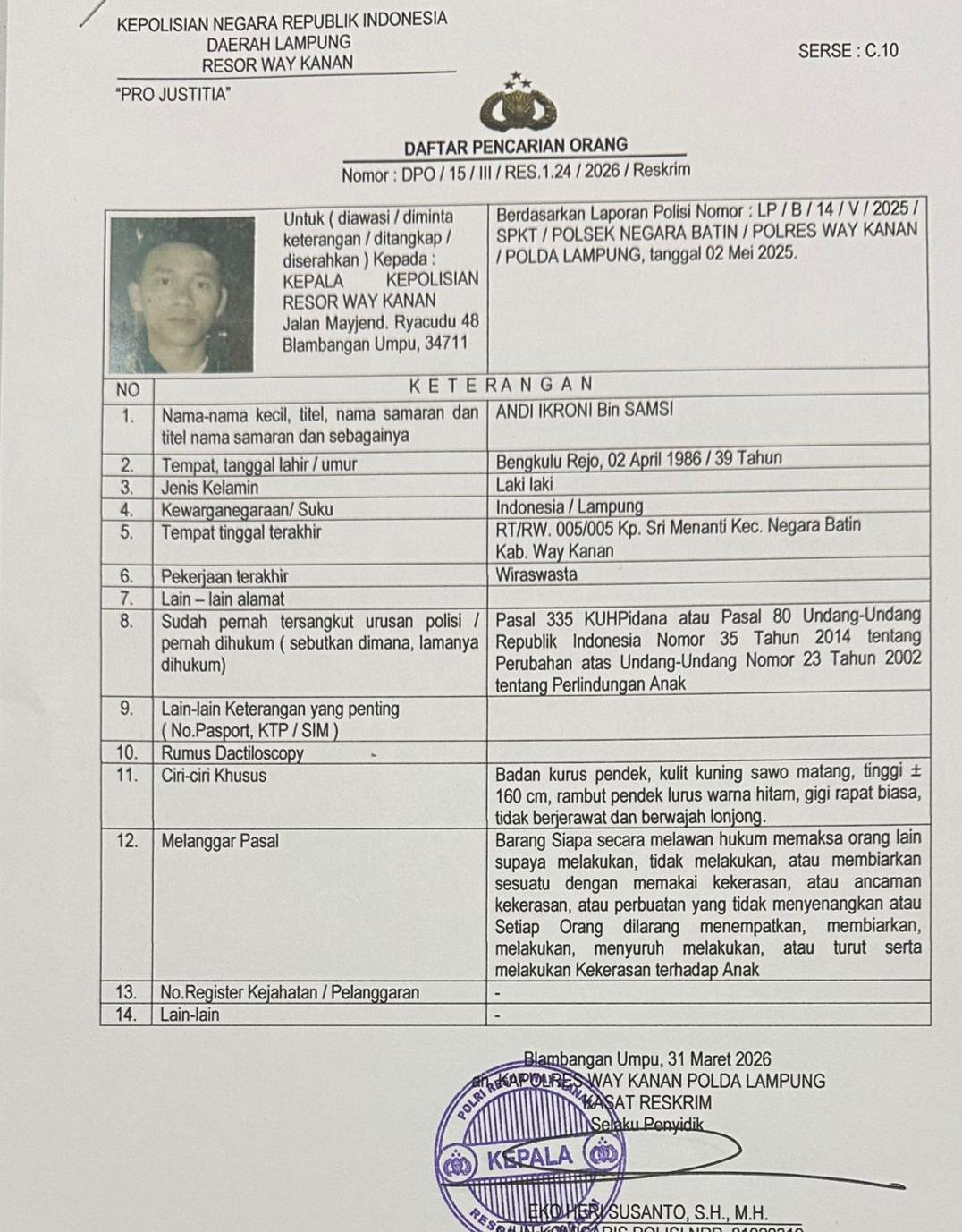 WAY KANAN – Setelah menghiraukan panggilan polisi sebanyak 2 kali dan selalu kabur saat dijemput paksa, Polres Way Kanan akhirnya menerbitkan Daftar Pencarian Orang Nomor ; DPO / 15 / III / Res.1.24 / Reskrim. Dan surat DPO Andi Ikroni ditandatangani oleh Kasat Reskrim Polres Way Kanan AKP Eko Susanto S.H.,M.H.