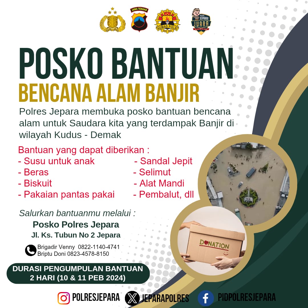 Jepara, Jawa Tengah – Respons terhadap bencana banjir di Kabupaten Demak dan Kudus telah mendorong Polres Jepara untuk membuka Posko kemanusiaan sebagai pusat penerimaan bantuan.