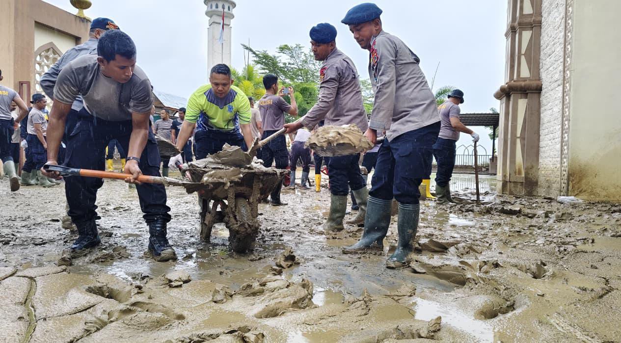 Museum bersejarah yang terletak di Desa Beuringen, Kecamatan Samudera, Kabupaten Aceh Utara itu sempat terendam banjir, menyisakan lumpur tebal di sejumlah ruangan. Sejak pagi hari, personel Polres Lhokseumawe dan Brimob tampak bahu-membahu membersihkan area museum menggunakan cangkul dan angkong untuk mengangkat lumpur.