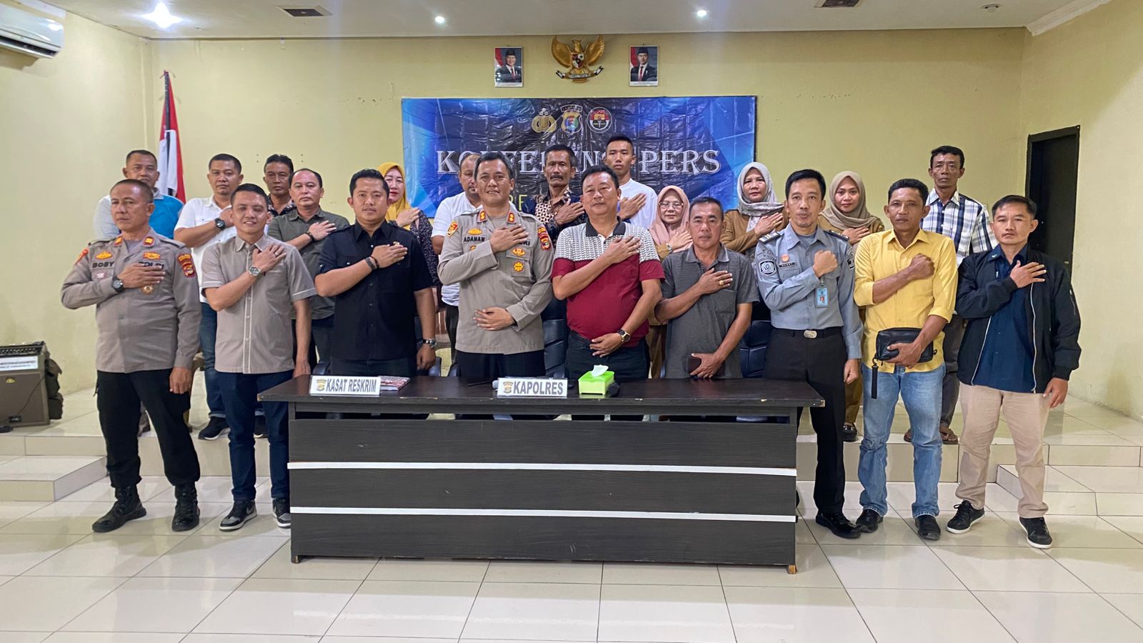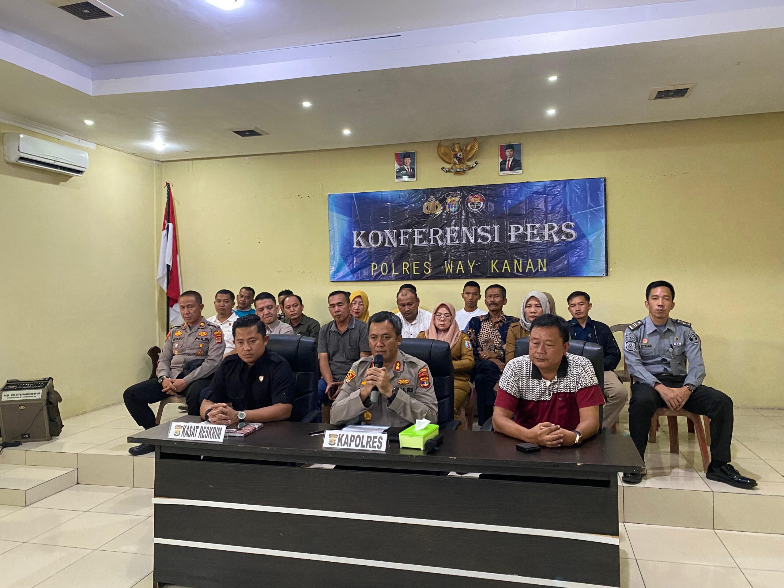 Way Kanan – Kapolres Way Kanan AKBP Adanan Mangopang didampingi Kasatreskrim AKP Sigit Barazili, Kapolsek Way Tuba Iptu Boby, Tokoh Masyarakat Way Kanan Sekaligus Wakil Ketua I DPRD Way Kanan Adinata melakukan konfrensi press hasil gelar perkara khusus Satreskrim Polres Way Kanan pada hari Selasa 04 Februari 2025 di Aula Adhi Pradana Mako Polres Way Kanan.