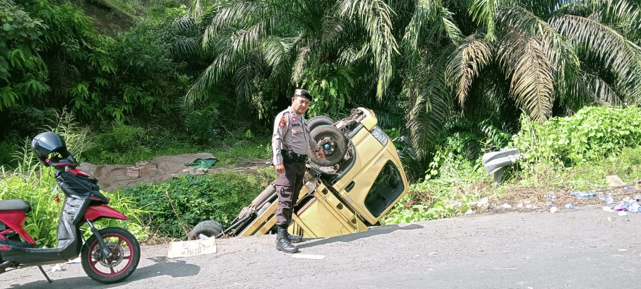 Petugas kepolisian bersama warga sekitar bekerja sama dalam proses evakuasi truk yang terbalik, memastikan tidak ada korban lain, serta menjaga keamanan lalu lintas di jalur tersebut.