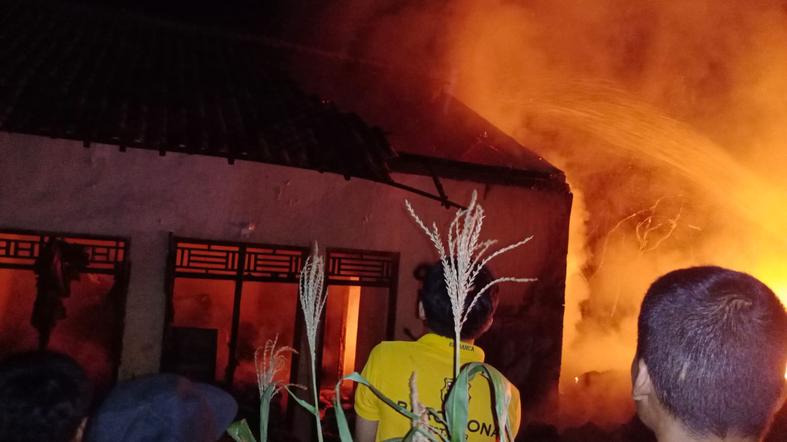 Pada saat itu saksi sedang berada rumah mendengar suara ledakan sebanyak 3 kali, kemudian keluar dan melihat gudang rongsok yang berada disamping rumah bagian belakang sudah terbakar. Lalu saksi menghubungin Kepala Kampung dan warga sekitar sambil berteriak meminta tolong memadamkan api yang membakar gudang rongsok.