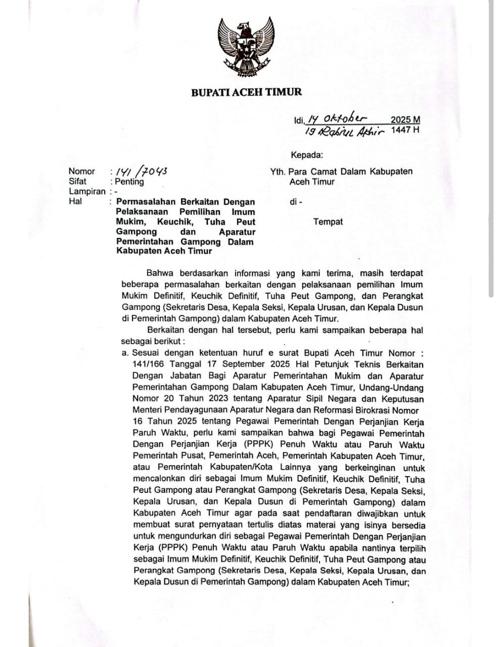 Bupati Aceh Timur Iskandar Usman Al-Farlaky Menyurati para Camat dalam Kabupaten Aceh Timur nomor: 141/7043 tanggal 14 Oktober 2025 dengan perihal: permasalahan berkaitan dengan pelaksanaan pemilihan Imum Mukim, Keuchik, Tuha Peut Gampong, dan Aparatur pemerintahan Gampong dalam Kabupaten Aceh Timur jelas dituliskan beberapa poin terkait rangkap jabatan PPPK dan PNS di Aceh Timur, berikut penjelasannya: