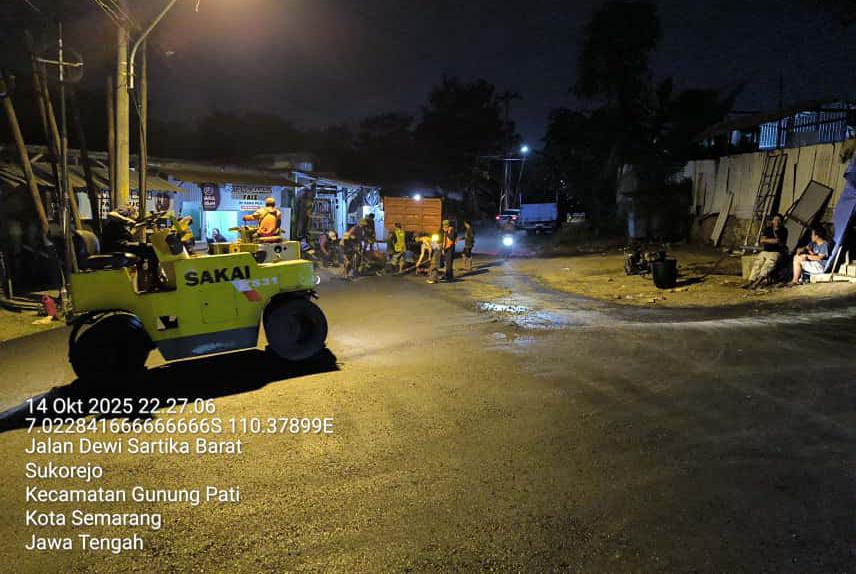 > “Saat ini kami melakukan perbaikan di Jalan Dewi Sartika Barat, Sukorejo, Kecamatan Gunungpati, Kota Semarang,” ujar Muso, perwakilan PT Praba Mas Hill, saat ditemui di lokasi, Selasa pagi (15/10/2025).