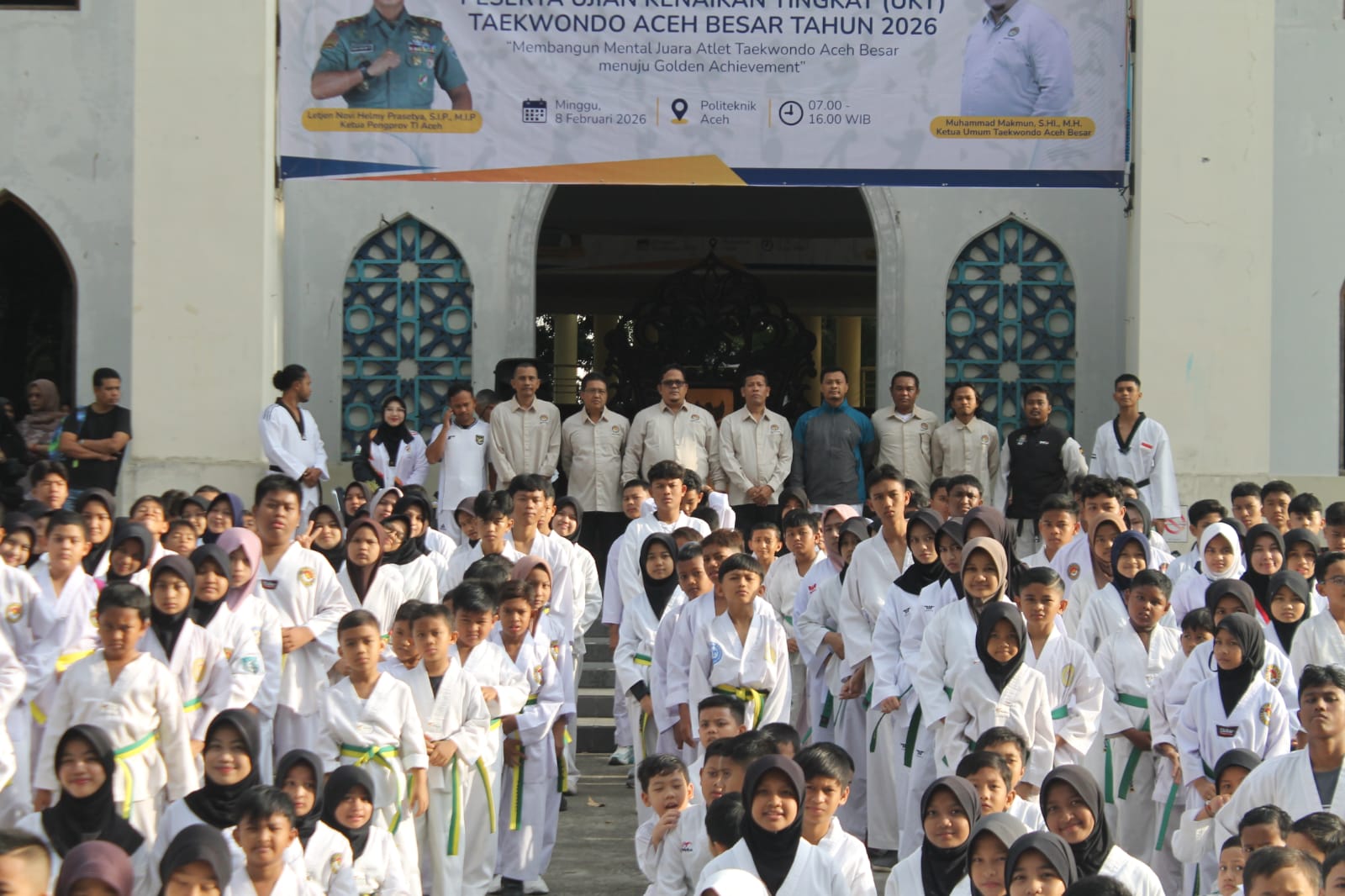 ACEH BESAR – Sebanyak 494 atlet Taekwondo dari 14 Dojang di bawah naungan Pengurus Kabupaten (Pengkab) Taekwondo Indonesia (TI) Aceh Besar mengikuti Ujian Kenaikan Tingkat (UKT) Geup, Minggu (08/02/2026). Kegiatan yang berlangsung di Politeknik Aceh ini mengusung tema “Membangun Mental Juara Atlet Taekwondo Aceh Besar Menuju Golden Achievement”, sebagai bagian dari pembinaan berjenjang dan berkelanjutan.