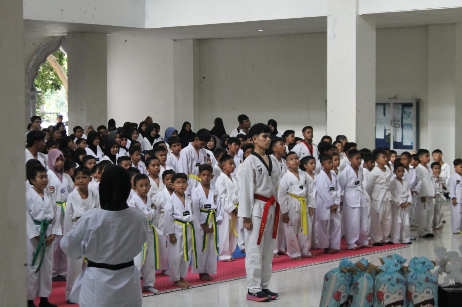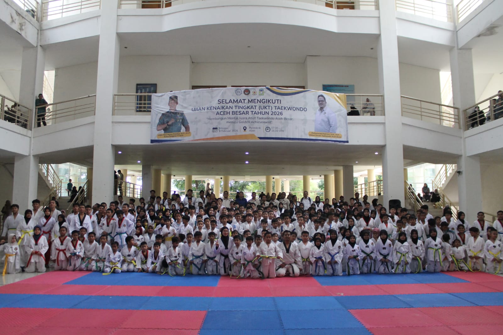 ACEH BESAR – Sebanyak 494 atlet Taekwondo dari 14 Dojang di bawah naungan Pengurus Kabupaten (Pengkab) Taekwondo Indonesia (TI) Aceh Besar mengikuti Ujian Kenaikan Tingkat (UKT) Geup, Minggu (08/02/2026). Kegiatan yang berlangsung di Politeknik Aceh ini mengusung tema “Membangun Mental Juara Atlet Taekwondo Aceh Besar Menuju Golden Achievement”, sebagai bagian dari pembinaan berjenjang dan berkelanjutan.