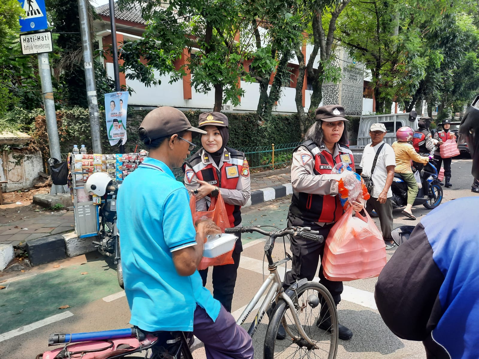 Tangerang – Kali ini, Polres Metro Tangerang kota membagikan makanan dan minuman gratis bagi para pejalan dengan kendaraan bermotor jelang sholat jumat di Jl. Perintis Kemerdekaan 2 Dan di Jl. Raya Daan mogot No. 52 Jumat (20/09/24) pagi.