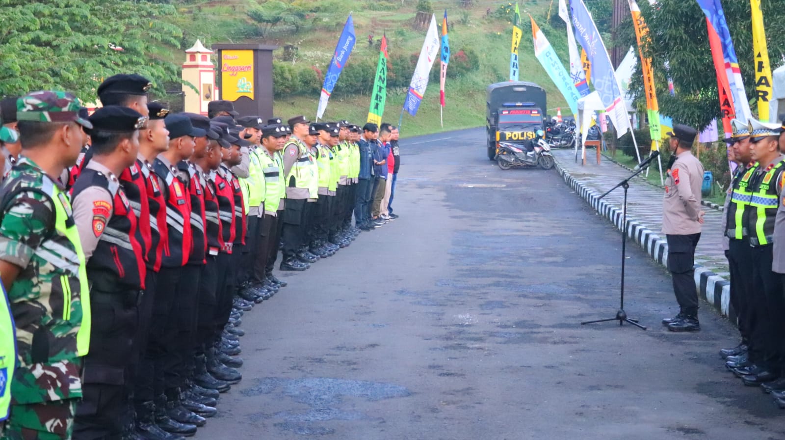 Apel digelar di lokasi obyek wisata Linggo Asri dengan melibatkan seluruh kekuatan personil yang terlibat dalam pengamanan tradisi syawalan.