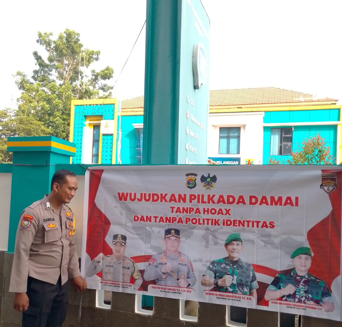 Lampung Tengah – Indonesia investigasi.com-Kepolisian Resor Lampung Tengah, Polda Lampung melalui seluruh anggota Bhabinkamtibmasnya serentak memasang spanduk himbauan yang bertema “Wujudkan pemilu damai tanpa politik uang, tanpa politik identitas dan menyebarkan berita hoax yang dapat memicu perpecahan”. Kamis (14/11/24)