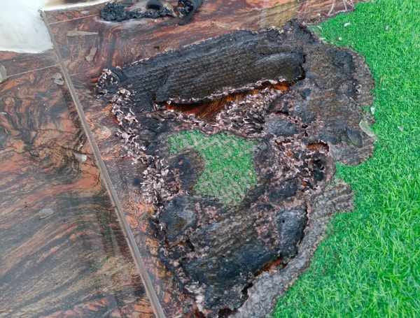 Disamping itu karpet sintetis yang ada di teras dan jendela kamar korban juga terdapat sisa pembakaran juga serpihan botol kaca.