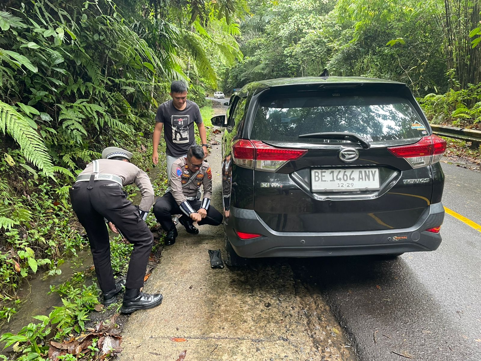 Lampung Barat, – Satlantas Polres Lampung Barat menunjukkan kepeduliannya kepada masyarakat dengan membantu pengemudi yang mengalami masalah di jalan.