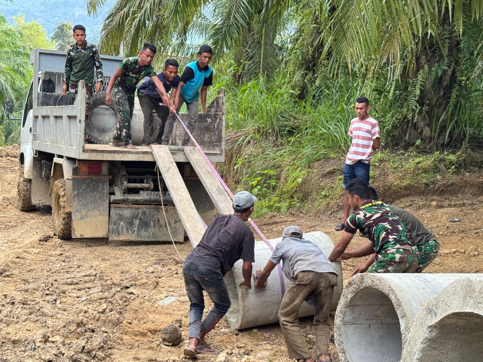 BIREUEN, ACEH – Suasana kebersamaan penuh semangat terlihat di Desa Jeumpa Sikureung, Kecamatan Jeunieb, Kabupaten Bireuen, saat anggota Satgas TNI Manunggal Membangun Desa (TMMD) Ke-127 Kodim 0111/Bireuen bersama warga bergotong royong menurunkan material gorong-gorong untuk pembangunan infrastruktur desa. Senin (9/3/2026).