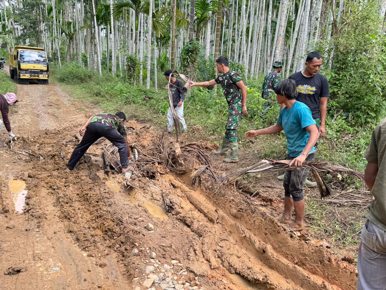 Dengan menggunakan alat sederhana dan material timbunan yang tersedia, prajurit TNI dan warga bekerja secara gotong royong menutup lubang-lubang jalan agar kembali aman dan nyaman dilalui.