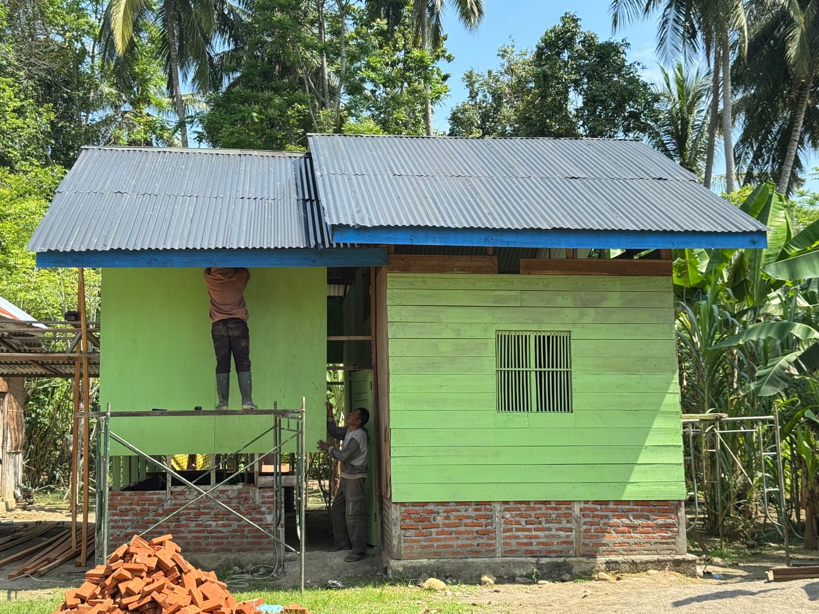 Terlihat anggota Satgas TMMD bekerja dengan penuh semangat melanjutkan proses pembangunan, mulai dari pemasangan rangka bangunan hingga penataan bagian dinding rumah. Setiap tahapan dikerjakan secara teliti agar rumah yang dibangun memiliki konstruksi yang kuat dan dapat ditempati dalam jangka waktu lama.