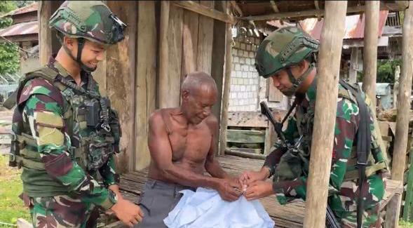 SUBIN — Anggota Pos Subin melaksanakan kegiatan pembagian pakaian layak pakai kepada masyarakat, khususnya orang tua dan anak-anak di sekitar wilayah Subin, Papua.