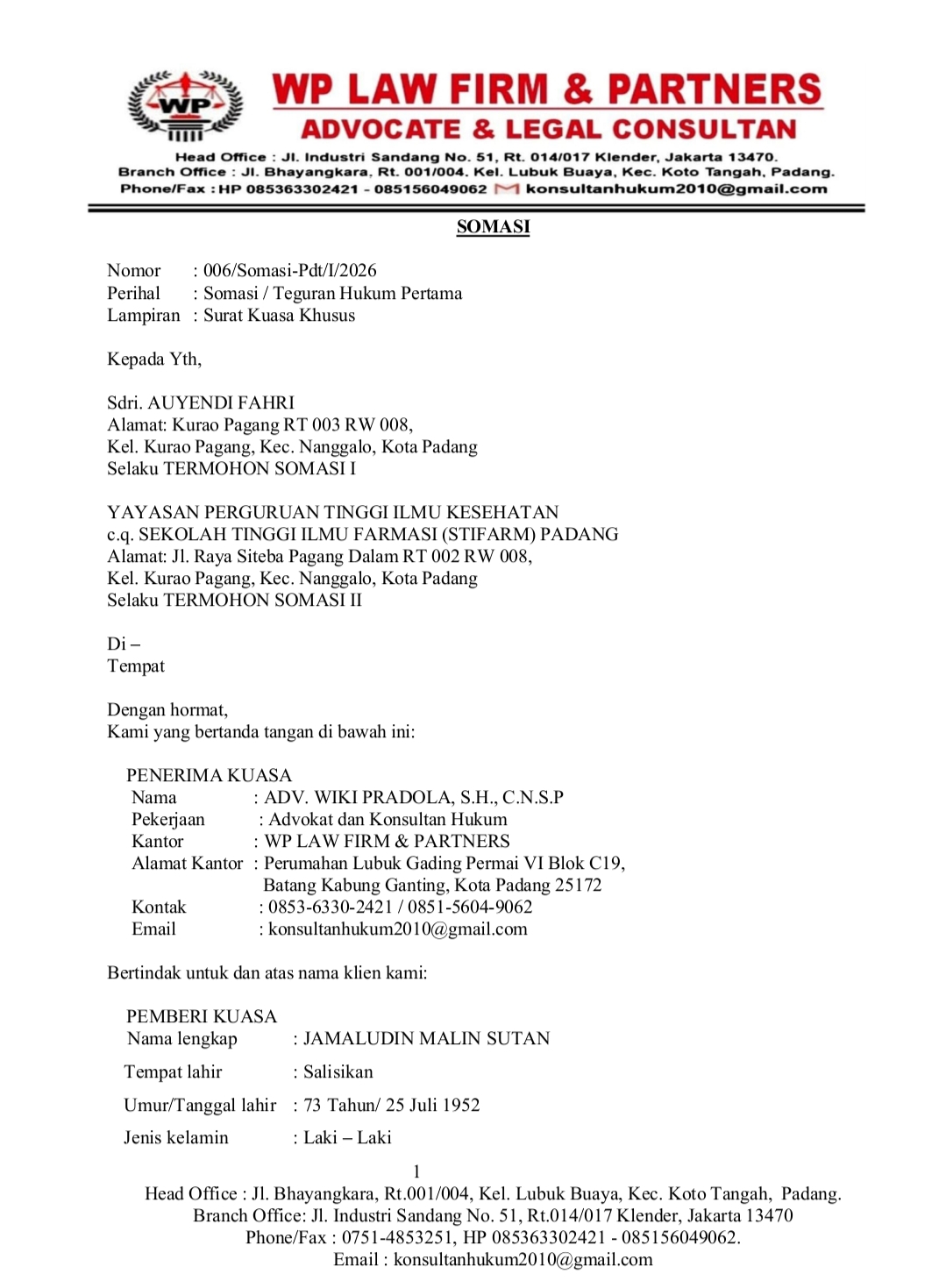 Somasi tersebut di sampaikan melalui kuasa hukumnya Adv. Wiki Pradola. S. H. C. NSP . Managing partner. W. P law firm & partner Tertanggal 19 Januari 2026 dengan Nomor 006/ somasi – Pdt / 1/ 2026.
