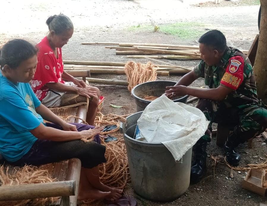 CILACAP, JATENG – Bakar semangat dan mendorong pengembangan usaha, Serka Bahrul Ulum Babinsa dari Koramil 05/Nusawungu, memberikan motivasi kepada para pengrajin tali dari sabut kelapa di Desa Banjareja, Kecamatan Nusawungu, Kabupaten Cilacap, Rabu (29/01/2025).