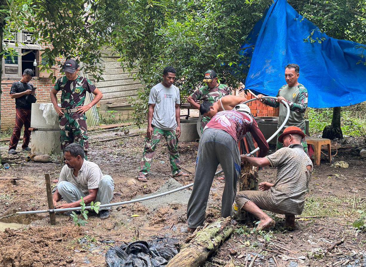 Di tengah kondisi tanah yang lembab dan medan yang menantang, personel Satgas TMMD bersama masyarakat tampak bahu-membahu memasang instalasi pipa sumur. Dengan peralatan sederhana dan semangat gotong royong, proses pengerjaan dilakukan secara teliti agar sumur dapat berfungsi optimal dan berkelanjutan.