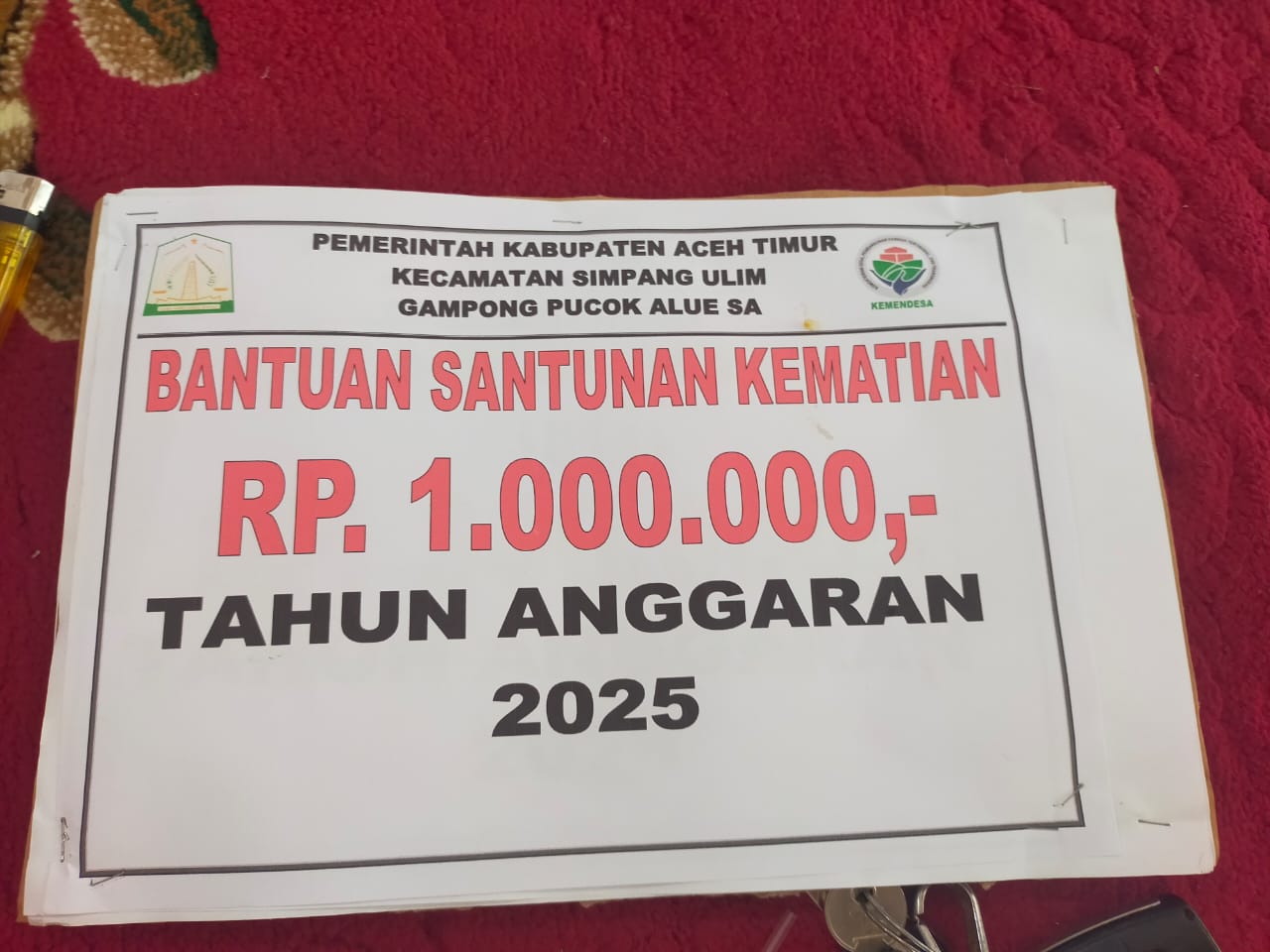 SIMPANG ULIM, ACEH TIMUR – Pemerintah Gampong Pucok Alue Sa, Kecamatan Simpang Ulim, Kabupaten Aceh Timur melaksanakan program santunan kematian bagi warganya.