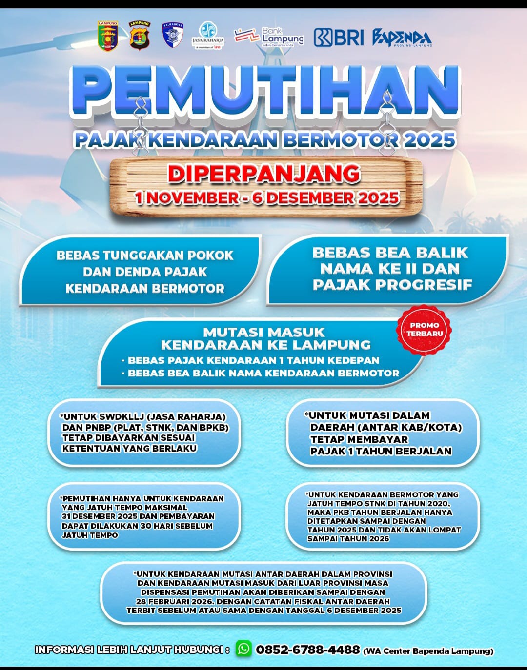 Gubernur Lampung memperpanjang pemutihan pajak mengingat animo masyarakat masih tinggi untuk keringan pajak kendaraan bermotor, mobil dan sepeda motor, tambah Slamet, Jumat (31/10/2025).