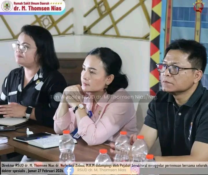 GUNUNGSITOLI – Direktur RSUD dr. M. Thomsen Nias dr. Noferlina Zebua, M.K.M didampingi oleh Pejabat Struktural menggelar pertemuan bersama seluruh dokter spesialis dalam rangka mengimplementasikan kebijakan terbaru pemerintah, yakni Peraturan Presiden Nomor 81 Tahun 2025 tentang Tunjangan Khusus Bagi Dokter Spesialis, Dokter Subspesialis, Dokter Gigi Spesiais, dan Dokter Gigi Subspesialis Yang Bertugas di Daerah Tertinggal, Perbatasan dan Kepulauan dan Peraturan Menteri Kesehatan Nomor 10 Tahun 2025 tentang Pelaksanaan Tunjangan Khusus Bagi Dokter Spesialis, Dokter Gigi Spesialis, Dokter Subspesialis, dan Dokter Gigi Subspesialis yang bertugas di Daerah Tertinggal, Perbatasan, dan Kepulauan (DTPK). Jumat, 27 Februari 2026