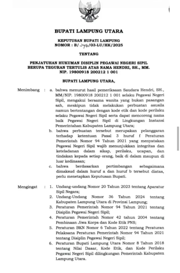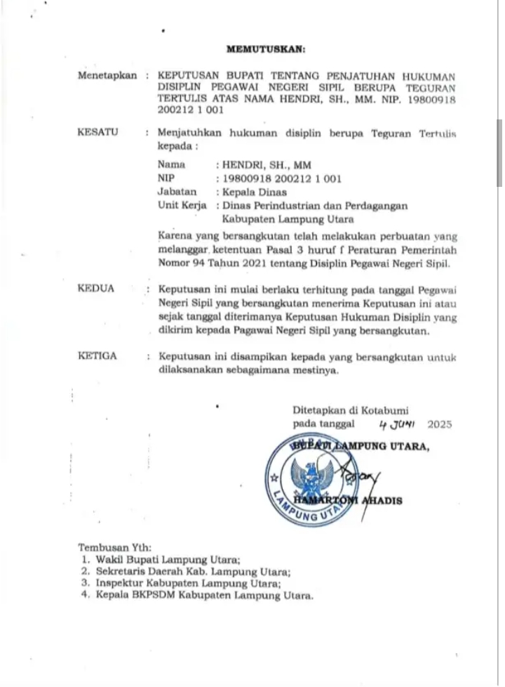 Toni menegaskan, atas perbuatan melanggar moral dan etika tentunya tidak sesuai dengan putusan pelanggaran aturan hukum atas perbuatan oknum ASN Kepala Dinas Perindustrian dan Perdagangan Kabupaten Lampung Utara, yang sempat menggemparkan masyarakat Lampung Utara beberapa waktu lalu. DImana Bupati Lampung Utara menutupi peristiwa tersebut dengan mengeluarkan Keputusan Bupati Lampung Utara Nomor : B/246/03-LU/HK/2025 tanggal 4 Juni 2025 Teguran Tertulis kepada oknum pejabat daerah Kabupaten Lampung Utara tersebut.