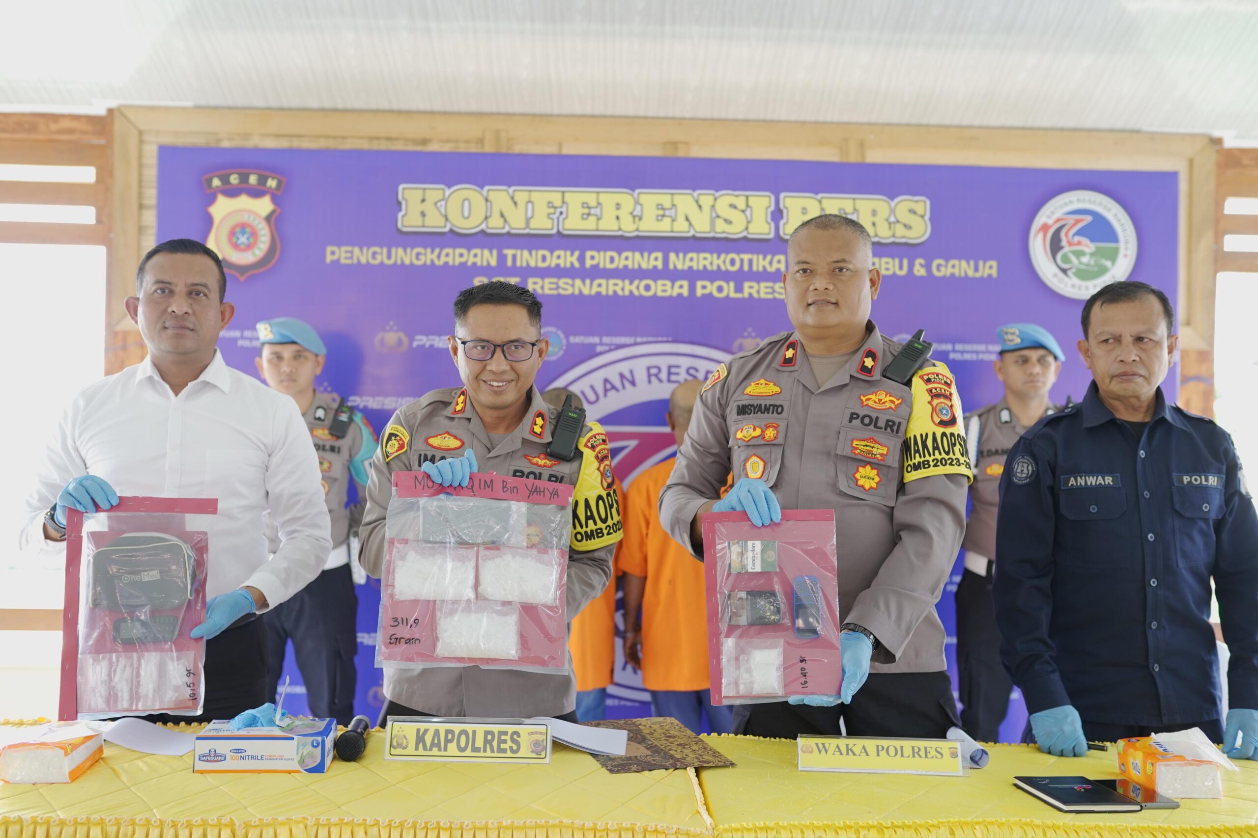 Kapolres Pidie, AKBP Imam Asfali, SIK, MH didampingi Wakapolres, Kompol Misyanto, SE, M.Si, Kasat Resnarkoba AKP Iskandar, SH, M.S.M dan Kasi Humas AKP Anwar, S.Ag, dalam Konferensi Pers menyebutkan, Satuan Resnarkoba Polres Pidie pada hari Selasa, tanggal 9 Januari 2024 berhasil lakukan penangkaan terhadap tersangka SR (52 thn).