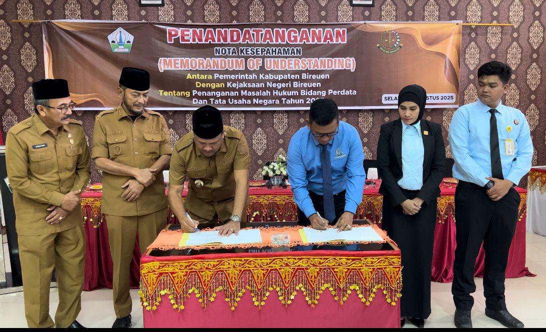 BIREUEN β Dalam upaya memperkuat koordinasi dan menciptakan tata kelola pemerintahan yang bersih, transparan, dan akuntabel, Kejaksaan Negeri (Kejari) Bireuen bersama Pemerintah Kabupaten (Pemkab) Bireuen resmi menandatangani Memorandum of Understanding (MoU) tentang Penanganan Masalah Hukum Perdata dan Tata Usaha Negara (TUN), Selasa (12/8/2025) di Oproom Kantor Bupati Bireuen.