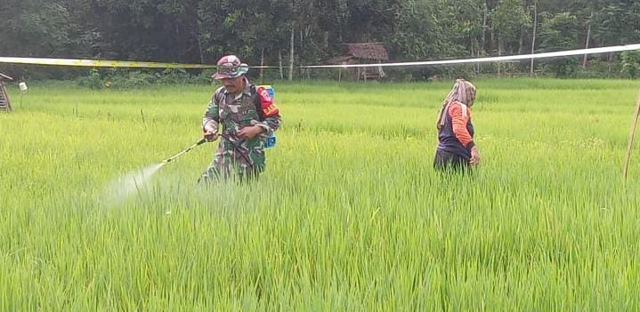 Sertu Harmadi dengan penuh semangat membantu Ibu Kamsiah, seorang petani dari Kelompok Tani Mekar Sari, melakukan penyemprotan tanaman padi jenis Empire di lahan seluas 0,8 hektar. Penyemprotan ini bertujuan untuk melindungi tanaman padi dari serangan hama dan penyakit yang dapat menyebabkan kerugian bagi petani.