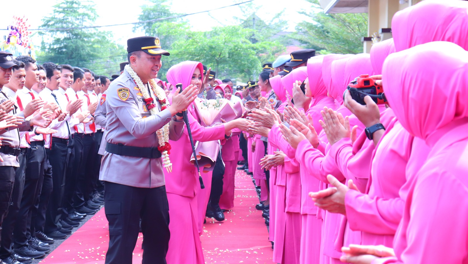 Kedatangan AKBP Rachmad bersama Ketua Bhayangkari Cabang Pekalongan disambut hangat oleh Wakapolres Pekalongan Kompol Muhammad Nurkholis, S.H., yang mengalungkan bunga di pintu gerbang Mapolres. Prosesi dilanjutkan dengan tradisi Pedang Pora yang khidmat, di mana jajaran perwira berbaris rapi membentuk gerbang kehormatan, mengiringi langkah sang Kapolres baru dengan penuh penghormatan.