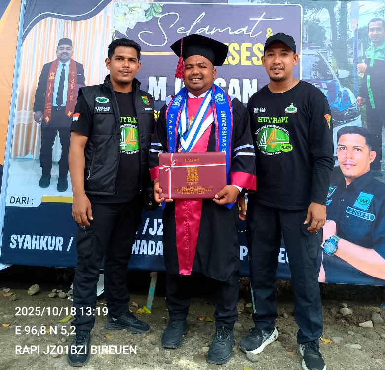 Suatu kebanggaan tersendiri bagi organisasi Radio Antar Penduduk Indonesia (RAPI) Wilayah JZ01ZZW05 Bireuen, karena salah seorang pengurus aktifnya, M. Ikhsan (JZ01AYV), resmi diwisuda sebagai Magister Pendidikan Agama Islam dalam prosesi tersebut.
