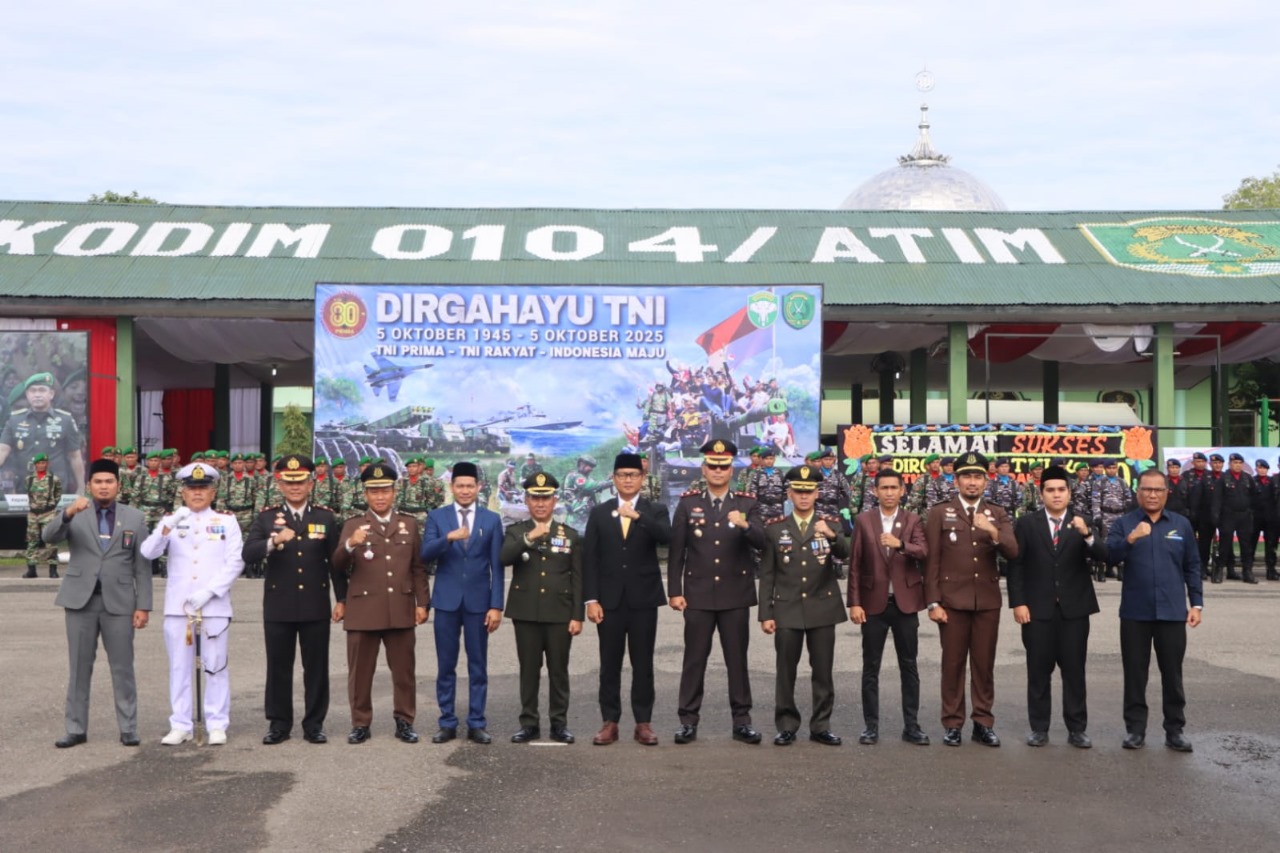 HUT Ke – 80 TNI Tahun 2025 mengusung tema “TNI Prima – TNI Rakyat – Indonesia Maju”, yang menggambarkan semangat profesional, tangguh, dan bersatu dalam mengawal kemajuan bangsa. Dandim 0104/Aceh Timur diwakili Kasdim Mayor Inf Hanafi selaku inspektur Upacara membacakan amanat Panglima TNI yang menegaskan pentingnya sinergitas antarinstansi, menjaga persatuan, serta meningkatkan peran TNI dalam mendukung pembangunan nasional dan kesejahteraan rakyat.
