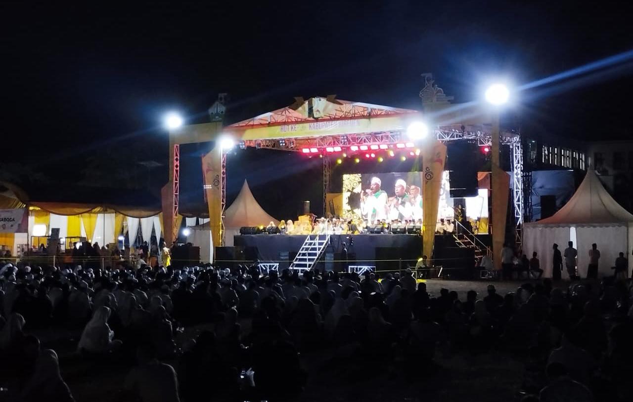 Suasana malam penuh khidmat, lantunan zikir menggema dari ribuan jamaah yang duduk beralas tikar di pelataran RTH Cot Gapu. Lampu-lampu panggung yang lembut menambah nuansa religius di tengah semilir angin malam.